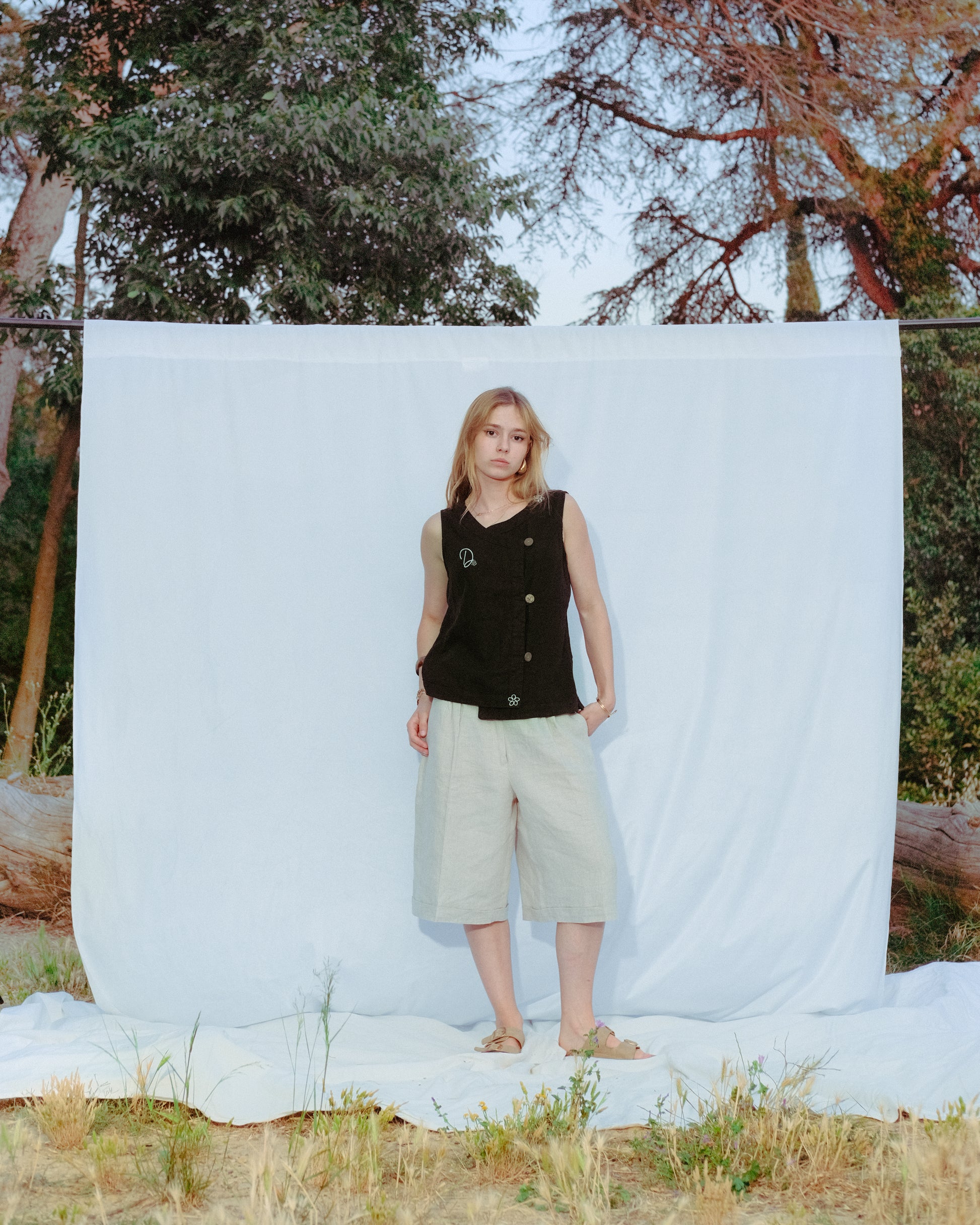 Bermuda large en lin beige, inspiré des tenues balnéaires des années 80.