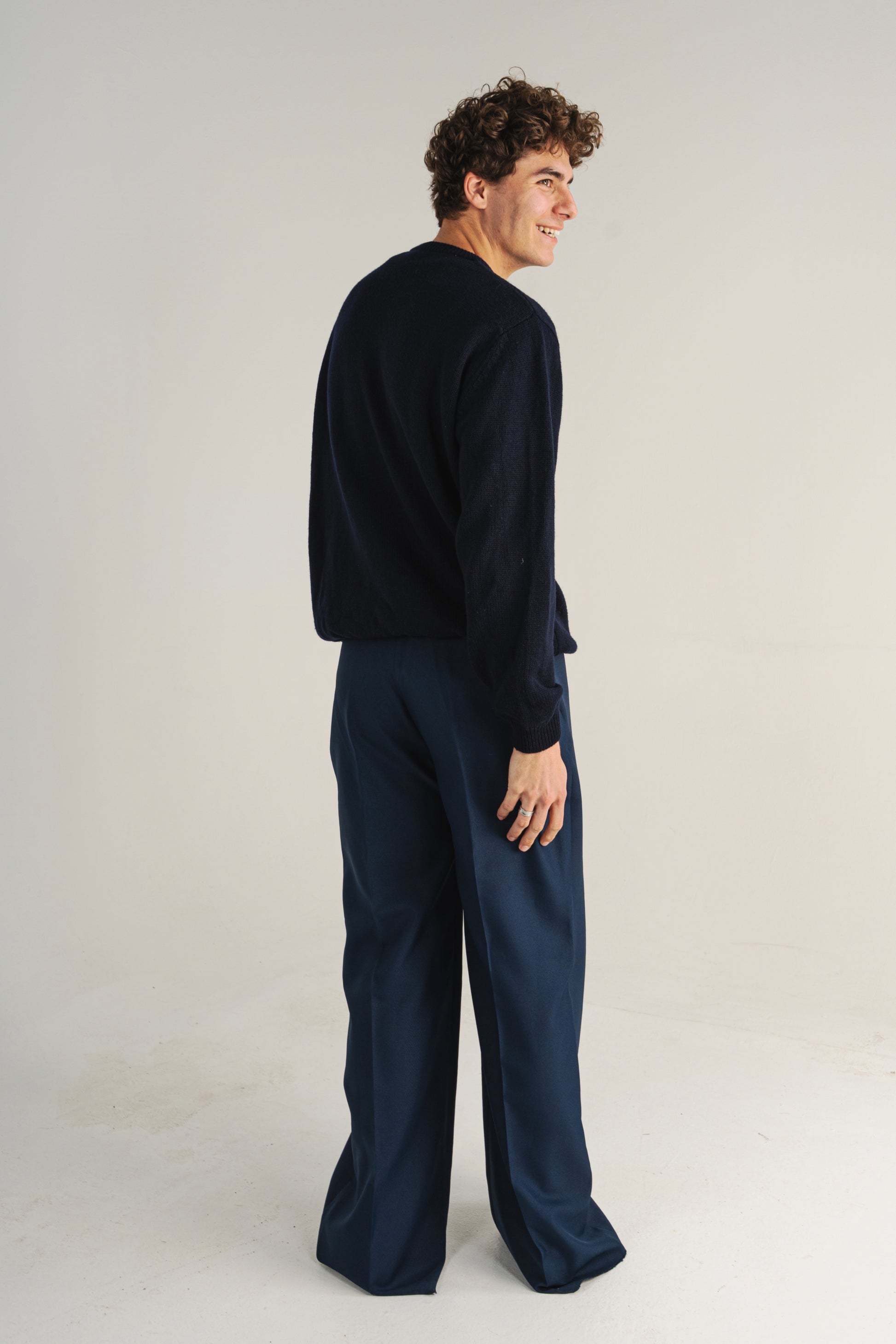 Pull bleu nuit en laine, type maille col rond.